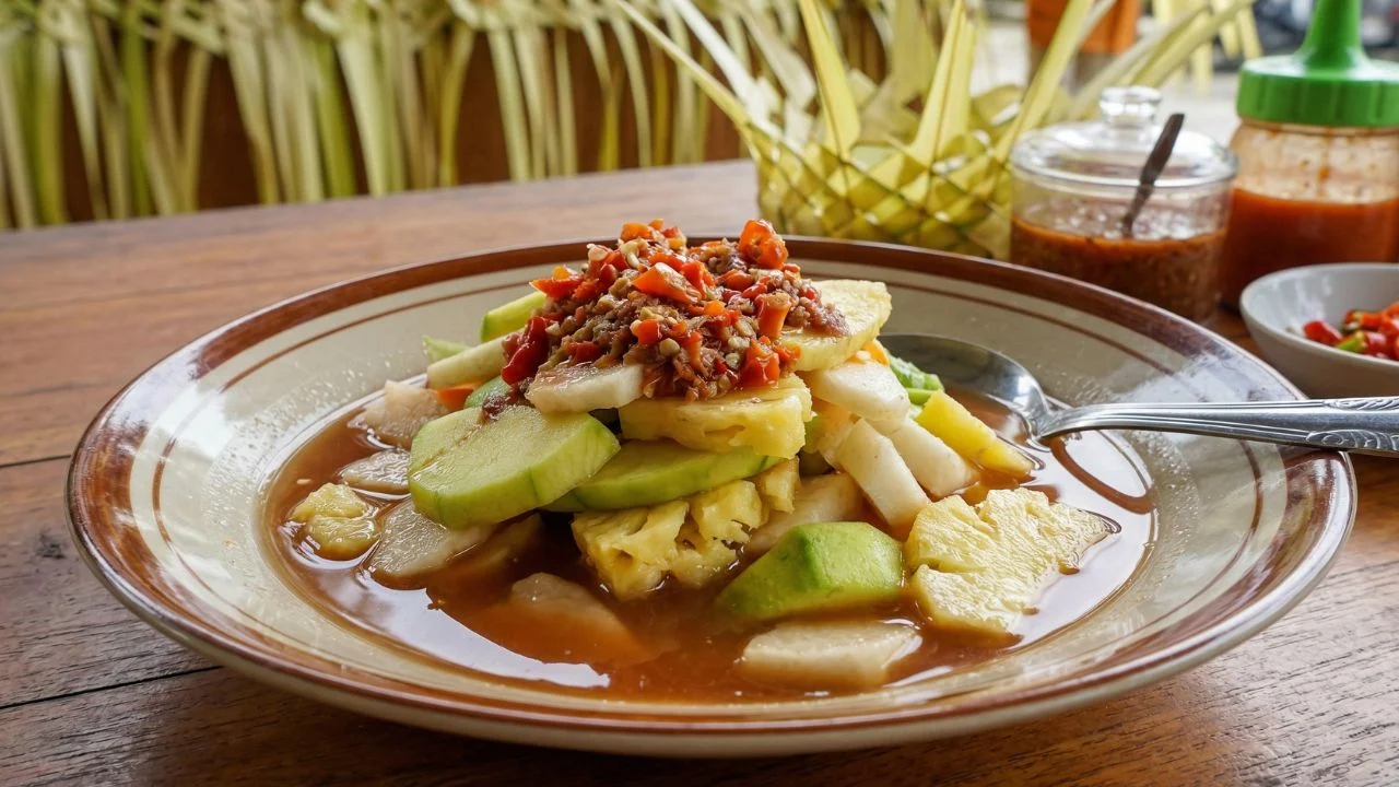 Las frutas son las mismas que en el rujak común: mango verde, kedondong, jícama, piña. La combinación de la acidez de la fruta, el picante del chile y el sabor salado y ligeramente a pescado del caldo puede sorprender a algunos al principio. Pero créeme, ¡el segundo y tercer bocado te engancharán de lo refrescante que es!