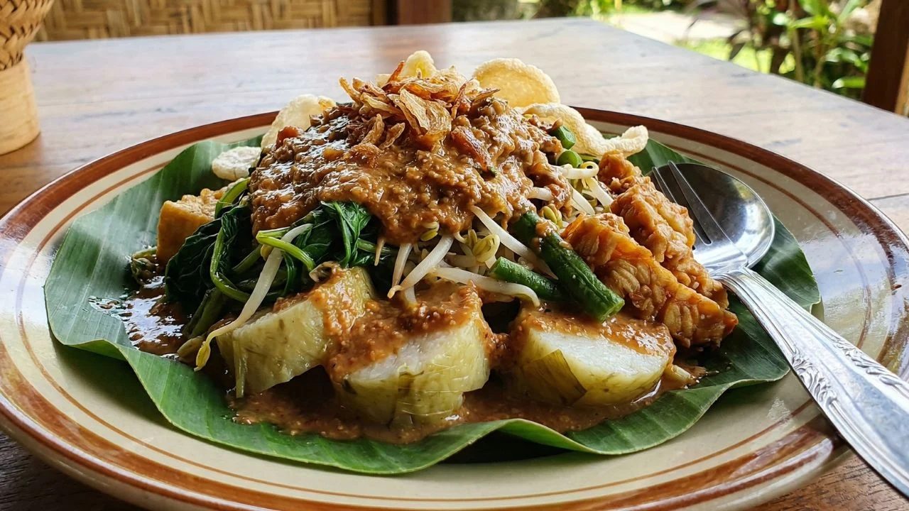 Se parece un poco al gado gado o al pecel, pero la salsa de cacahuete es característica porque a menudo se mezcla con kencur y un chorrito de jugo de limón, lo que le da un aroma más fresco y un sabor más picante y mordaz. Simple, muy económico, pero inolvidable.