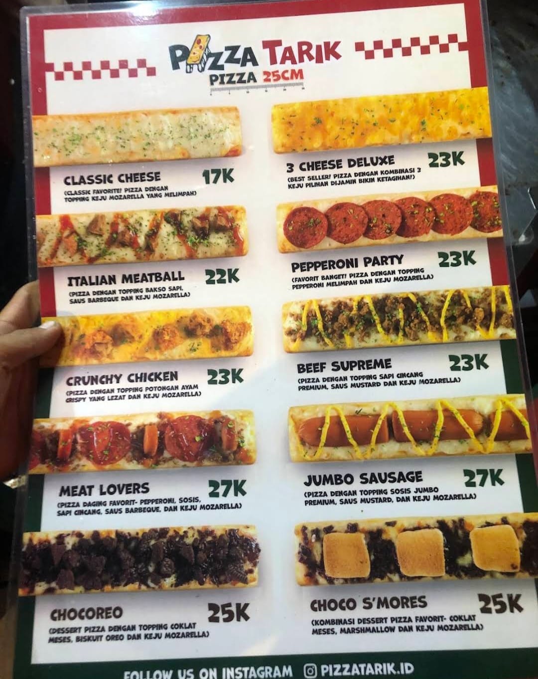 En cuanto al precio, Pizza Tarik ofrece un valor excepcional. Con un rango de precios muy asequible, los clientes pueden elegir entre una variedad de deliciosos toppings. Los precios varían, comenzando desde 17.000 Rupias (Rp) para la opción clásica, simple pero deliciosa, hasta 27.000 Rupias para la variante más premium, cargada con abundantes toppings, como meat lovers o jumbo sausage.