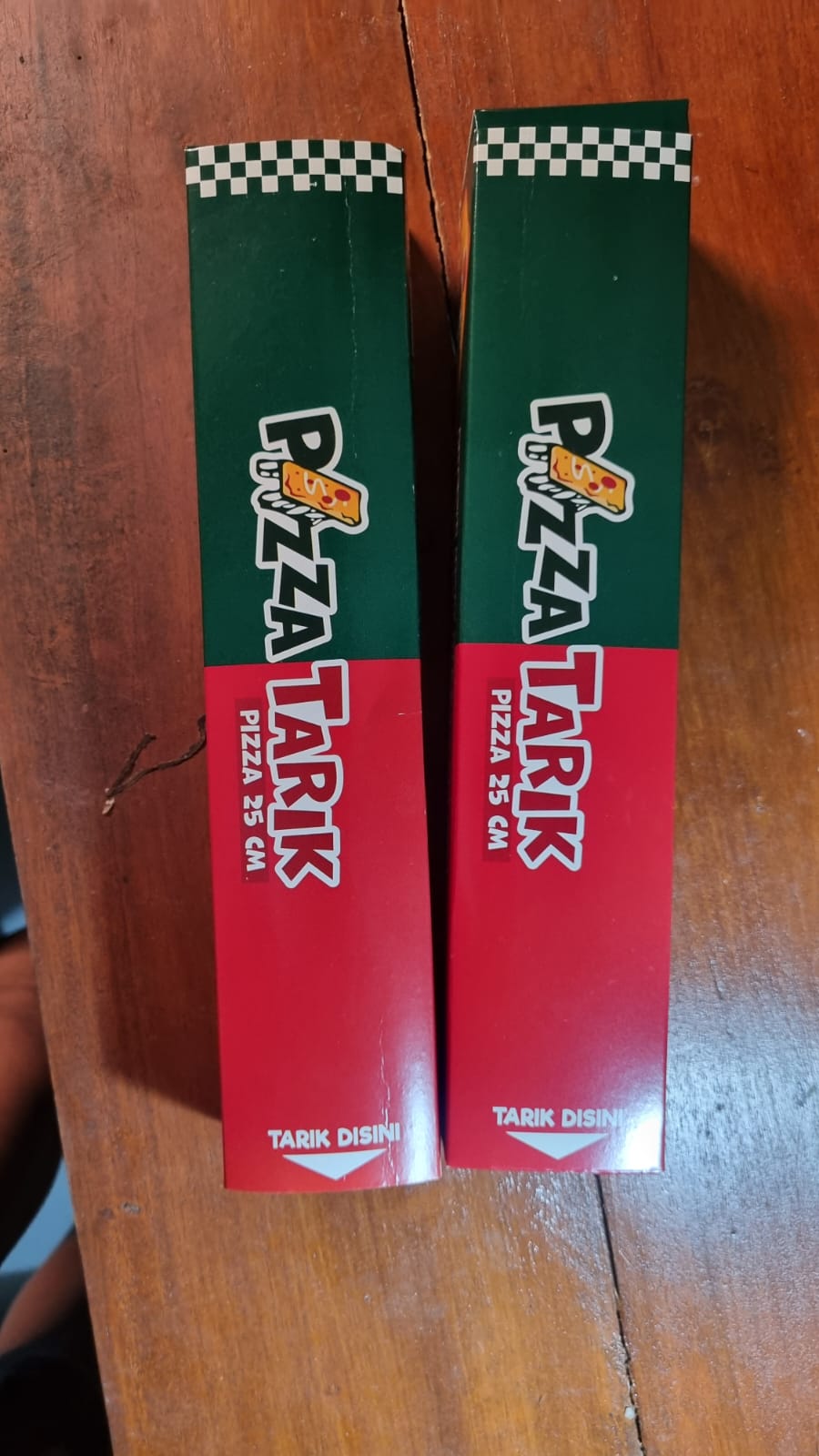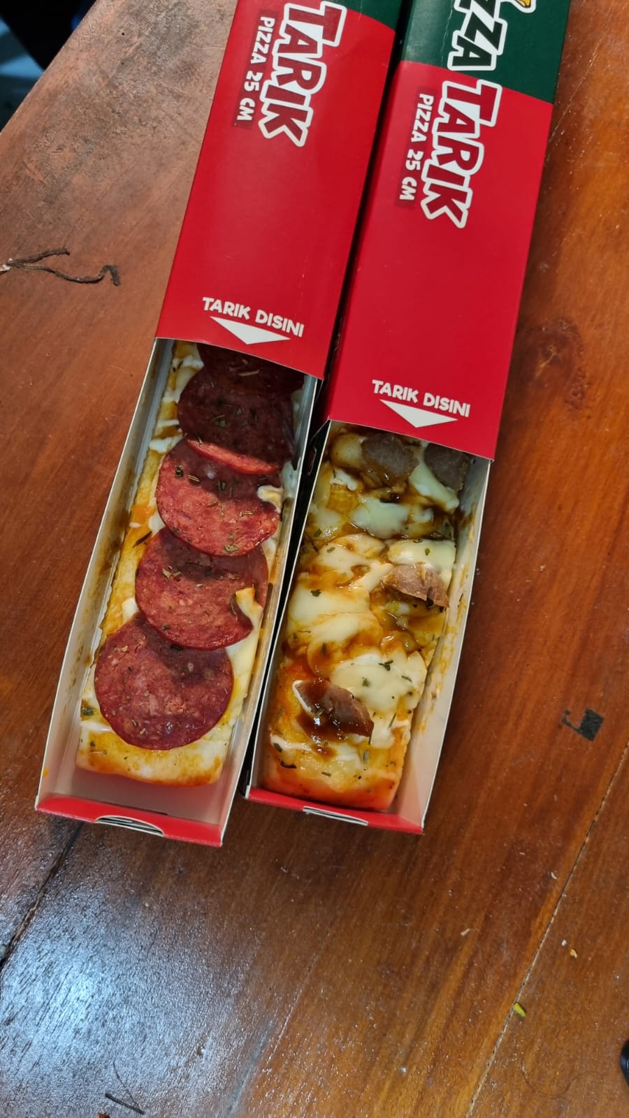 Para la comodidad del cliente, Pizza Tarik ofrece dos opciones de comida. Puede elegir comer en el lugar (dine-in) y disfrutar de la pizza caliente directamente del horno. Sin embargo, si prefiere disfrutarla en casa o en el camino, la opción para llevar (take away) también está disponible con un empaque práctico.